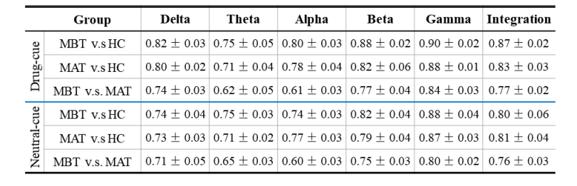 在藥物相關線索呈現時,TP10和CP2 通道的 gamma頻段的RBP 對 干預前 與 HC 的分類貢獻最大,表明這些腦區在 METH 渴求的神經表征中具有重要作用。