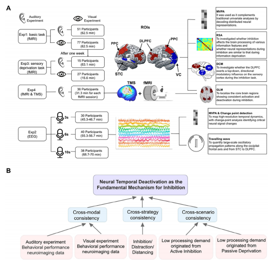 抑制功能通常被分為兩大系統(tǒng):一是競(jìng)爭(zhēng)性抑制(competition-induced inhibition),即優(yōu)先處理目標(biāo)信息而忽略干擾(如在嘈雜環(huán)境中專(zhuān)注于某個(gè)人的講話(huà)) ;二是直接抑制(direct inhibition),即主動(dòng)阻止對(duì)特定刺激的處理(如壓抑不想要的想法)。傳統(tǒng)上,學(xué)界將這兩種抑制機(jī)制視為功能獨(dú)立的過(guò)程,并分別研究其神經(jīng)基礎(chǔ)。然而,新興證據(jù)表明兩者在認(rèn)知控制機(jī)制和結(jié)果上存在重疊[1-3],暗示其可能共享一個(gè)通用的神經(jīng)架構(gòu) 。盡管已有研究描繪了其重疊的神經(jīng)空間模式[4-5],但其時(shí)間動(dòng)態(tài)——即抑制過(guò)程中的神經(jīng)活動(dòng)如何隨時(shí)間演變——仍然是一個(gè)尚未探索的關(guān)鍵科學(xué)問(wèn)題。