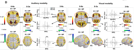 “先激活,后失活”的動(dòng)態(tài)特征:在抑制的早期階段(約0-3秒),額頂葉控制網(wǎng)絡(luò)(DLPFC/PPC)被激活;而在后期階段(約3-6秒),該網(wǎng)絡(luò)的激活水平逐漸下降,同時(shí)感覺(jué)皮層(聽(tīng)覺(jué)/視覺(jué)皮層)的失活水平則進(jìn)行性加深。抑制行為表現(xiàn)越好,感覺(jué)皮層的這種動(dòng)態(tài)失活就越顯著(圖2)。