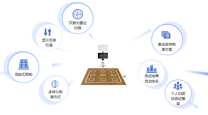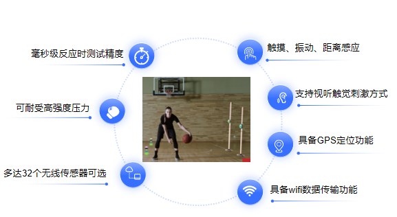 該系統可通過多樣化的視覺、聽覺、空間感知、壓力,并可以附加電、磁等刺激,訓練和測試運動員的原地踏步頻率、記憶速度、靈敏性、跳躍能力、轉體反應、大腦速度意識、跑動時間、距離等運動素質能力,是綜合大腦能力發展速度水平的創新訓練和測試系統。